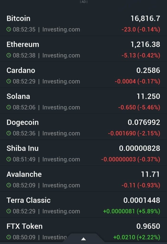 وانخفضت عملة البيتكوين وهي العملة الرقمية الأكبر والأشهر في العالم بنسبة 0.14%، لتصل إلى 16.816.7 دولار، كما انخفضت عملة إيثريوم بنسبة 0.42% دولار مسجلة 1.216.38 دولار، وانخفضت عملة كاردانو بنسبة 0.17% لتسجل 0.2586 دولار.