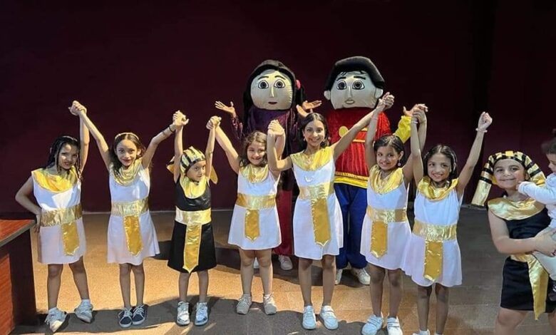 ومن ضمن العروض ارتدى مجموعة من الاطفال الزي الفرعوني، كما تم عرض فيلم كرتوني بعنوان “يحيا وكنوز” مع وجود ماسكات شخصيات “يحيا وكنوز”.