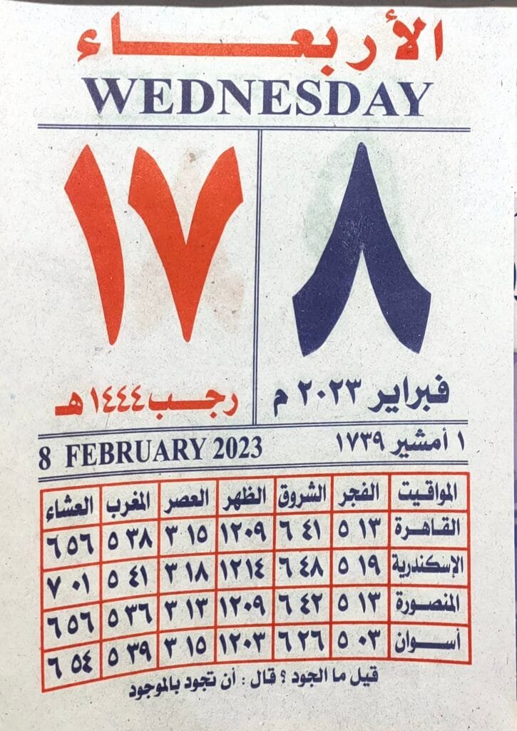اليوم الإثنين هو 6 فبراير 2023 ميلاديًا، الموافق 15 من رجب 1444 هجريًا، 29 طوبة 1739.