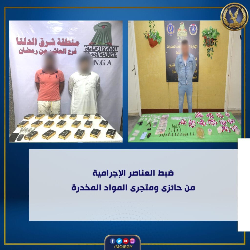 ضبط (أحد العناصر الإجرامية) حال تواجده بدائرة قسم شرطة ثان العاشر من رمضان بالشرقية ، وبحوزته (كمية من مخدرى “الحشيش، الهيروين”- مبلغ مالى – هاتف محمول).